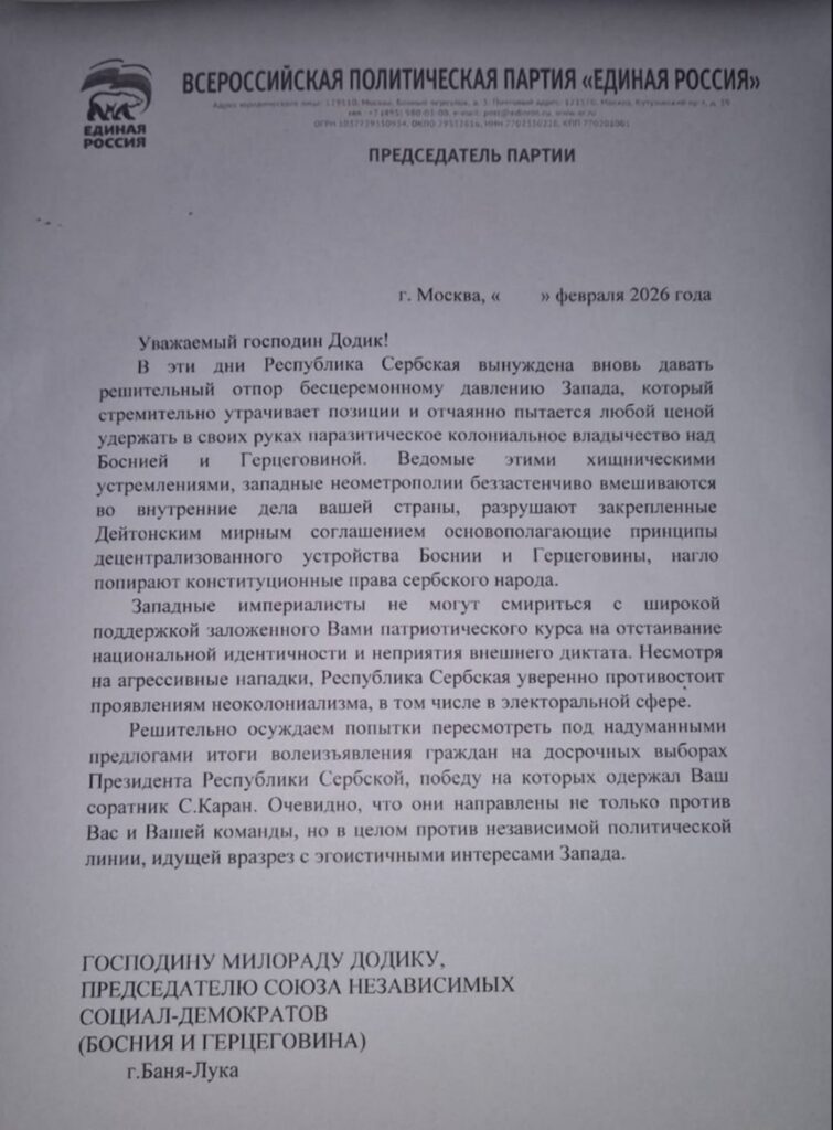 07.02.2026. | 20:34Predsjednik Sveruske političke stranke “Јedinstvena Rusija” Dmitrij Medvedev uputio je pismo predsjedniku SNSD-a Miloradu Dodiku, u kojem je istakao punu podršku Republici Srpskoj, osuđujući, kako je naveo, pritiske Zapada i pokušaje miješanja u unutrašnje političke procese u BiH.