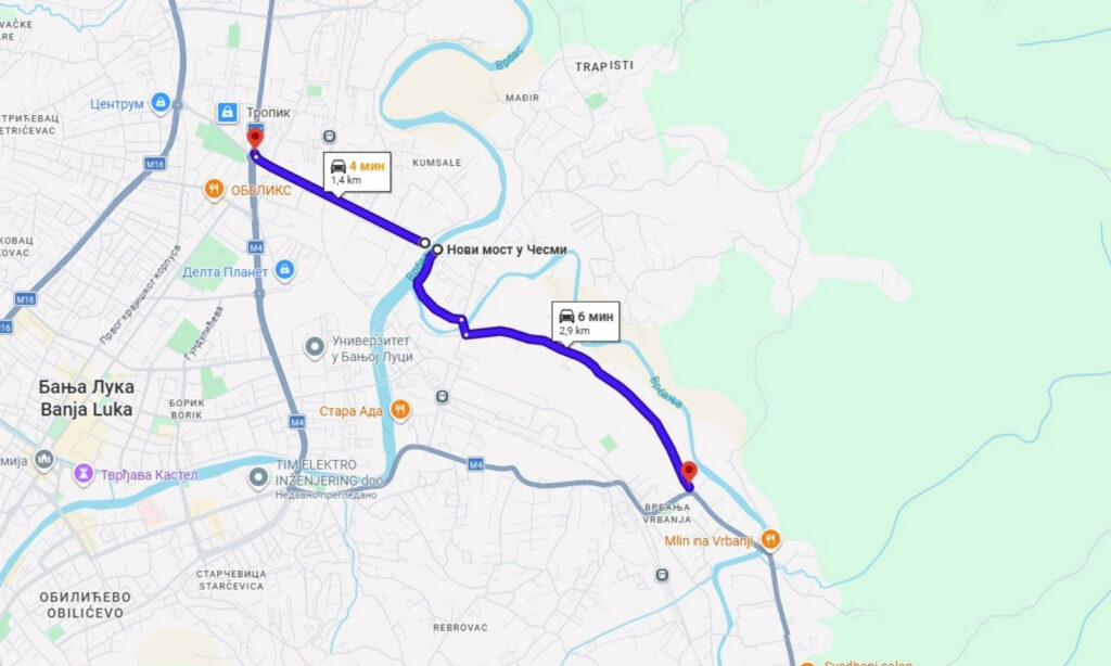 09.04.2026. | 14:12Otvaranjem novog mosta u banjalučkom naselju Česma vozači iz pravca Čelinca, Kotor Varoša i Vrbanje prvi put dobijaju direktnu vezu prema Lazarevu i zapadnom dijelu Banjaluke, bez kruženja preko Rebrovačkog mosta i naselja Ada. Poređenje ruta pokazuje da se na dijelu puta između Vrbanje i kružnog toka kod Lesnine vožnja sada skraćuje za oko 1,4 kilometra, dok je nova trasa jednostavnija i rasterećuje najopterećenije gradske pravce.