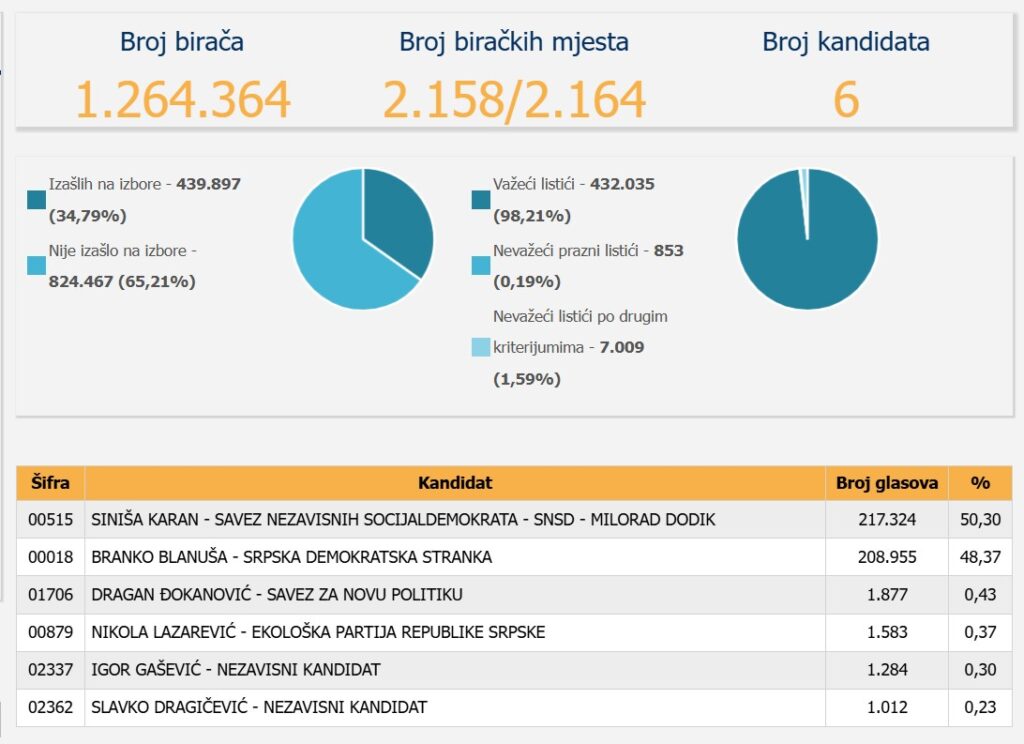 Prema tim podacima, Branko Blanuša, kandidat SDS-a je osvojio 208.955 glasa ili 48,37 odsto glasova na redovnim biračkim mjestima.