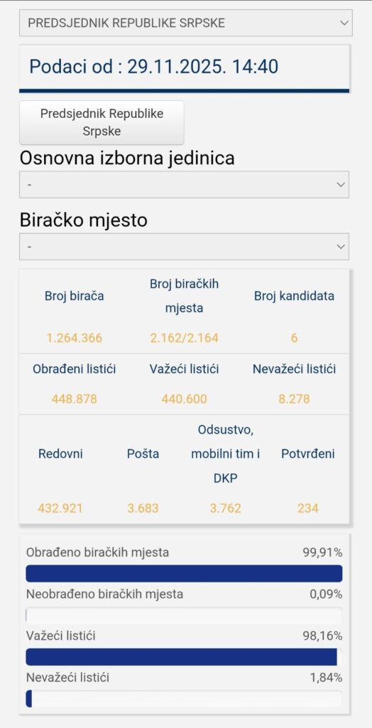 U odnosu na jučerašnji izveštaj vidljivo je da je danas CIK BiH obradio i 3.683 glasa pristigla poštom, te da Blanuša ima 0,04 odsto manje glasova dok je Karan zadržao isti procenat.