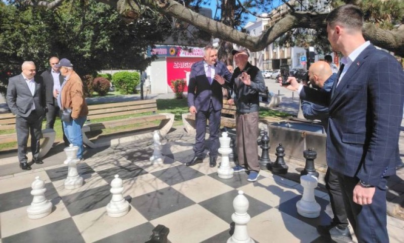 Nakon polaganja vijenaca premijer Savo Minić je kratko zastao i razgovarao sa penzionerima koji igraju šah u parku.
