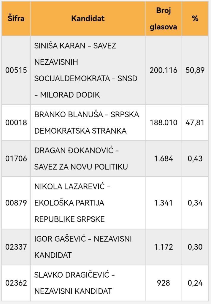 23.11.2025. | 23:06Preliminarni, nezvanični rezultati prijevremenih izbora za predsjednika Republike Srpske pokazuju da je kandidat SNSD-a Siniša Karan osvojio 200.116 glasova ili 50,89 odsto, dok je kandidat SDS-a Branko Blanuša osvojio 188.010, odnosno 47,81 odsto glasova, podaci su Centralne izborne komisije BiH.
