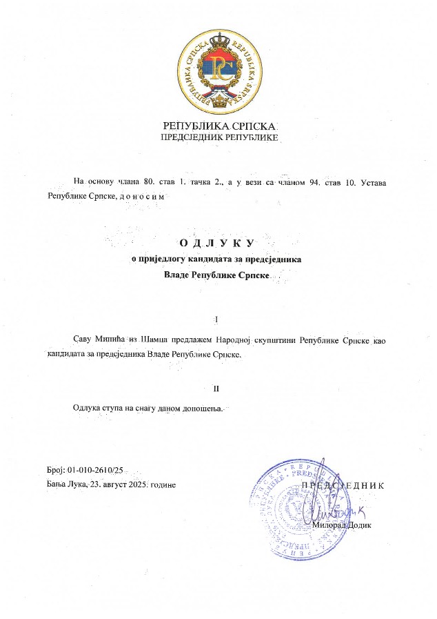 29.09.2025. | 12:35Da bismo spriječili zlonamjerne tvrdnje i manipulacije da je ovlašteni predlagač gospodina Save Minića za mandatara bio neko drugi, a ne Milorad Dodik, taj dokument od 23. avgusta objavljujemo na internet stranici Narodne skupštine Republike Srpske, saopštio je predsjednik Narodne skupštine Nenad Stevandić.
