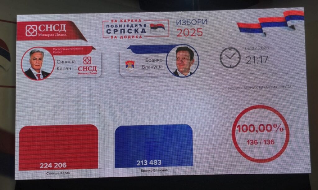 08.02.2026. | 21:33Nakon proglašenja izborne pobjede kandidtata SNSD-a Siniše Karana na prijevremenim i na 136 biračkim mjesta ponovljenim izborima za predsjednika Republike Srpske, u ovoj stranci počelo je slavlje.