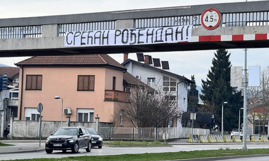 Na jednom transparentu, postavljenom na betonskoj pasareli, ispisana je poruka „Srećan rođendan!“, dok na drugom stoji: „Jedan je branio Srpsku u ratu, a drugi je brani u miru!“.