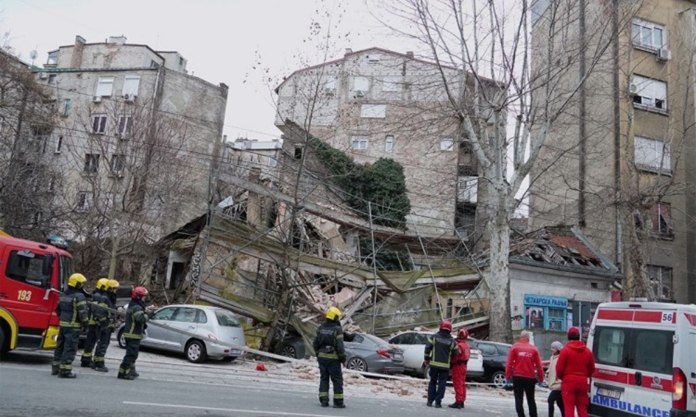31.01.2026. | 15:02U Ulici Džordža Vašingtona u centru Beogradu srušio se dio napuštene kuće i dio građevinske skele koja je bila naslonjena na kuću.