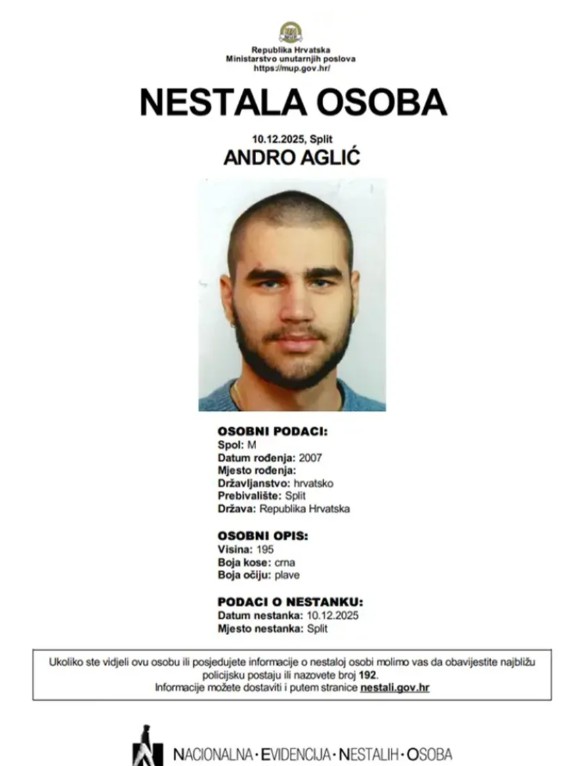 10.12.2025. | 14:40Hrvatska policija intenzivno traga za 17-godišnjim Androm Aglićem iz Splita, koji se danas udaljio s adrese stanovanja i od tada mu se gubi svaki trag.