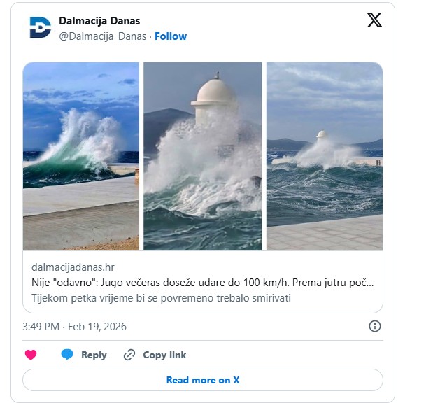 19.02.2026. | 20:21Snažno nevrijeme praćeno jakim vjetrom i obilnim padavinama pogodilo je priobalne dijelove u Hrvatskoj, a najkritičnije je na području Dalmacije gdje kombinacija niskog pritiska i olujnog juga uzrokuje izraženu ciklonsku plimu.