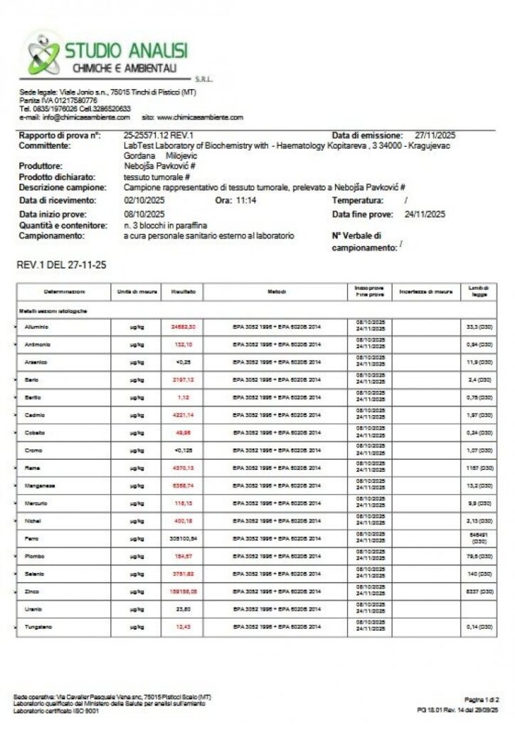 Laboratorijska analiza tumorsnog tkiva generala Pavkovića izvršena u akreditovanoj italijanskoj laboratoriji Chimiche e ambientali, ISO 9001, koja je kvalifikovana od Ministarstva zdravlja Italije.