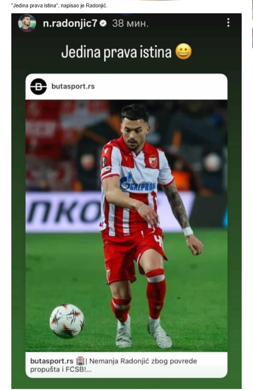 24.11.2025. | 19:35Nemanja Radonjić, fudbaler Crvene zvezde, podijelio je objavu portala “Butasport” na kojoj piše da zbog povrede neće igrati protiv FCSB u petom kolu Lige Evrope.