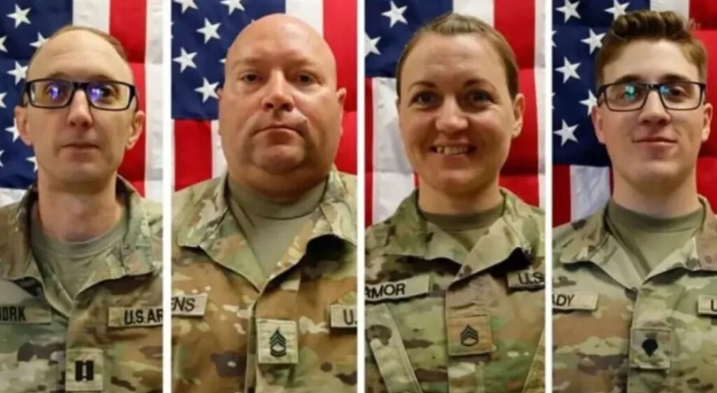 Četvoro preminulih, svi pripadnici rezervnog sastava američke vojske, identifikovani su u utorak – kapetan Kodi Kork (35), narednik Noa Titjens (42), narednica Nikol Amor (39) i narednik Deklan Koudi (20).
