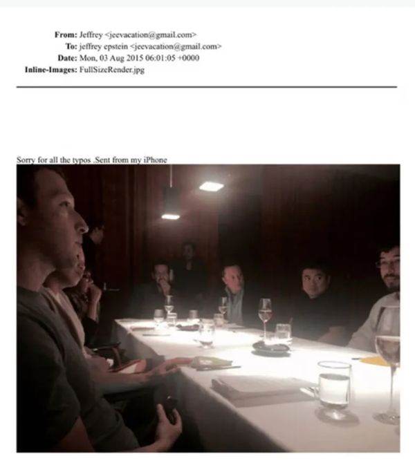 Na slici, koju je objavilo Ministarstvo pravde SAD kao dio paketa od 3,5 miliona dokumenata o slučaju, a koju je Epstajn poslao sam sebi na mejl, vide se osnivač Fejsbuka Mark Zakerberg i šef SpaceX-a Ilon Mask kako sjede za večerom sa još nekoliko ljudi. Epstajn je fotografiju sebi poslao 3. avgusta 2015. godine, dan nakon što se hvalio sastankom sa tehnološkim liderima na luksuznoj večeri.