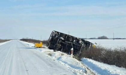 08.01.2026. | 18:04Oko 15 časova došlo je do saobraćajne nezgode u blizini Velike Grede, u Srbiji, kada se kamion koji je prevozio gajbe piva prevrnuo na bok. Na fotografiji sa lica mjesta vidi se teretno vozilo oboreno…