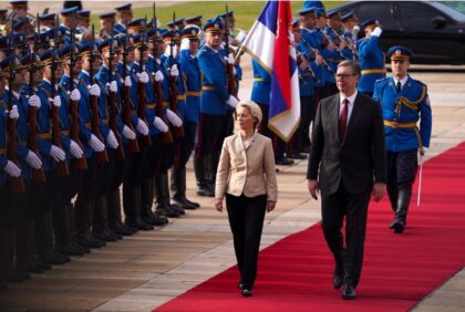 15.10.2025. | 09:24Predsjednik Srbije Aleksandar Vučić i predsjednica Evropske komisije Ursula fon der Lajen započeli su danas u Beogradu tet-a-tet sastanak. Prethodno je Vučić ispred Palate Srbija dočekao Fon der Lajen…