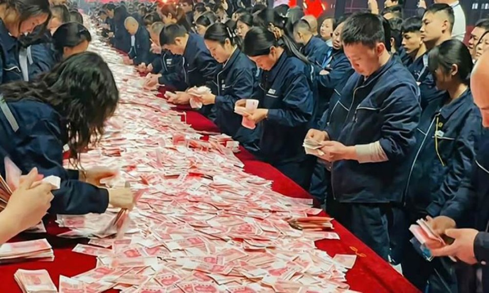 During a Chinese New Year celebration, Henan Kuangshan Crane piled up mountains of cash for 7,000 employees.