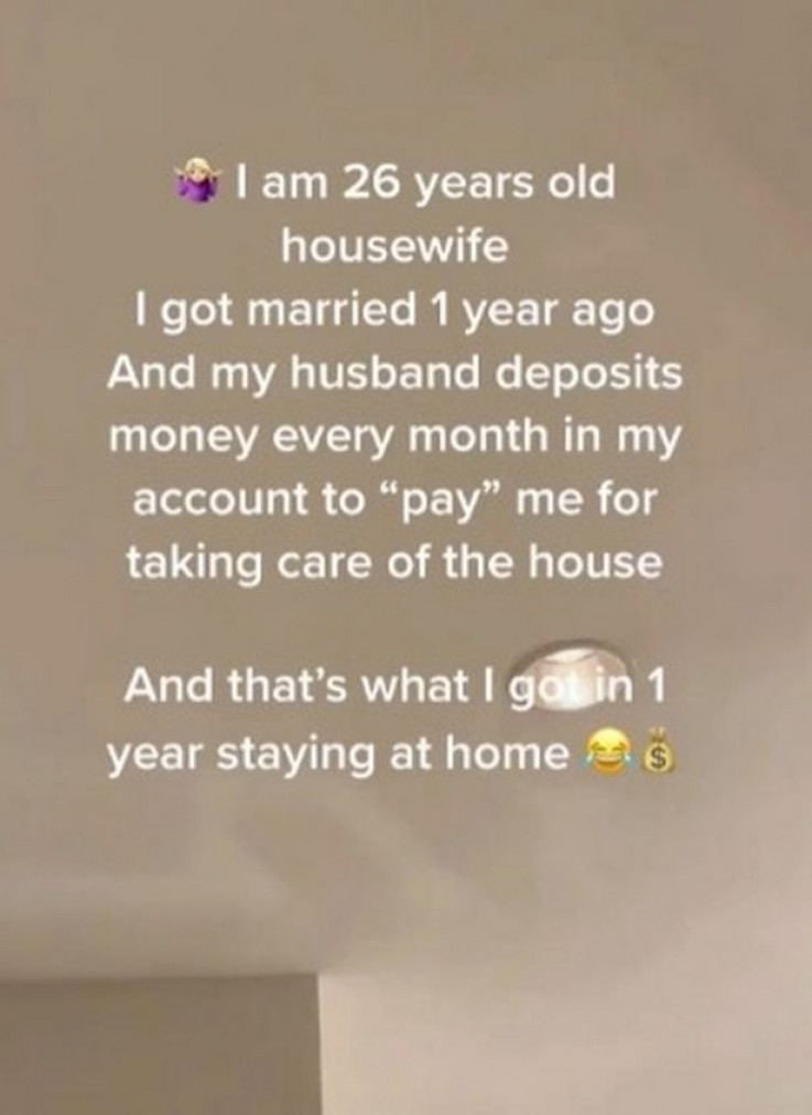 “Imam 26 godina i domaćica sam. Udala sam se prošle godine i moj suprug mi svakog mjeseca stavlja novac na račun kako bi mi platio to što vodim domaćinstvo”, napisala je u svojoj objavi korisnica TikToka, koja se predstavlja samo kao “Mrs”. Nakon toga, objavila je sliku svog stanja na računu, gdje može da se vidi kako u banci ima 191.565,11 dolara.